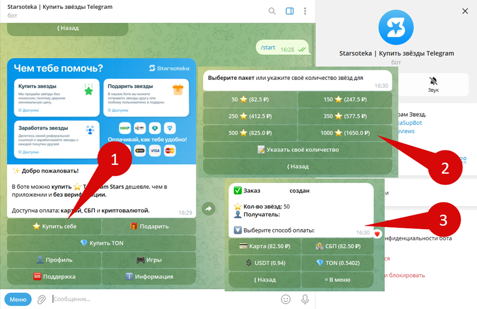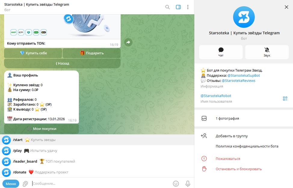 Покупка и продажа звезд или TON осуществляется при помощи официального мини-приложения. Рабочий бот Starsoteka доступен по адресу @ StarsotekaRobot. Среди основных команд: