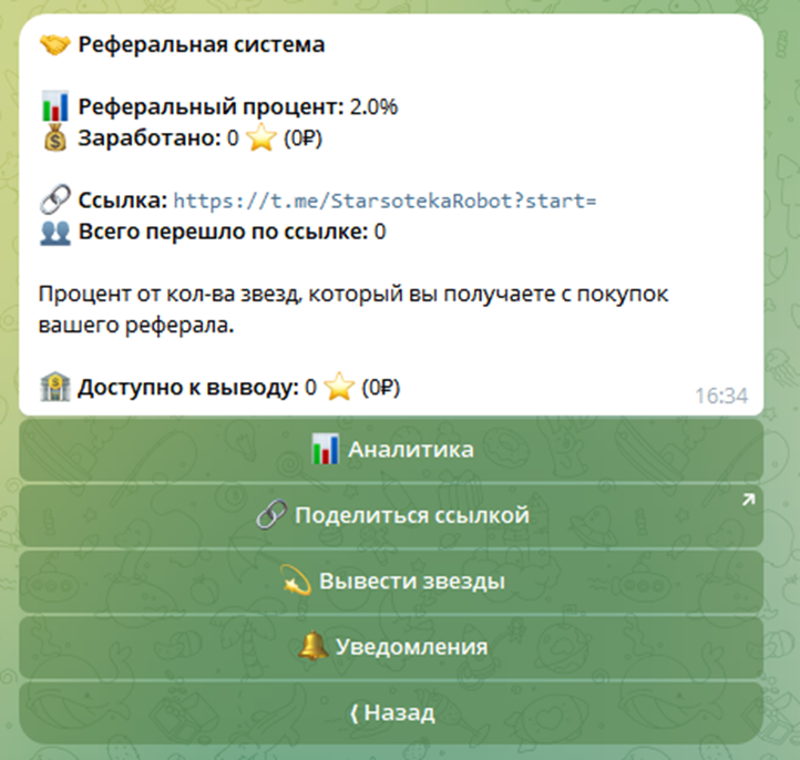 Бонусы начисляют по прогрессивной системе. Минимальное вознаграждение — 2% от суммы покупки реферала. Вывод заработка доступен, если баланс превышает 50 Stars.