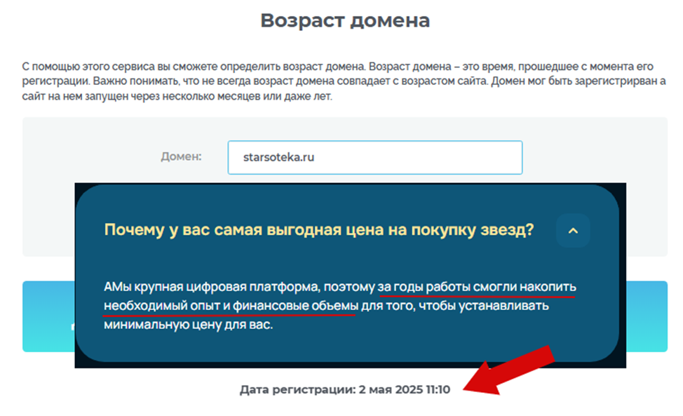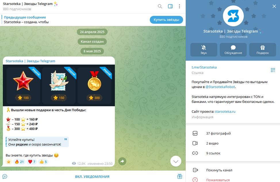 Маркет позиционируют как крупную цифровую платформу с многолетним опытом работы и солидным резервом Telegram Stars. Проверка показывает, что фактически проект Starsoteka развивается с мая 2025 года. Именно в этот период был зарегистрирован домен и создан официальный тг-канал.