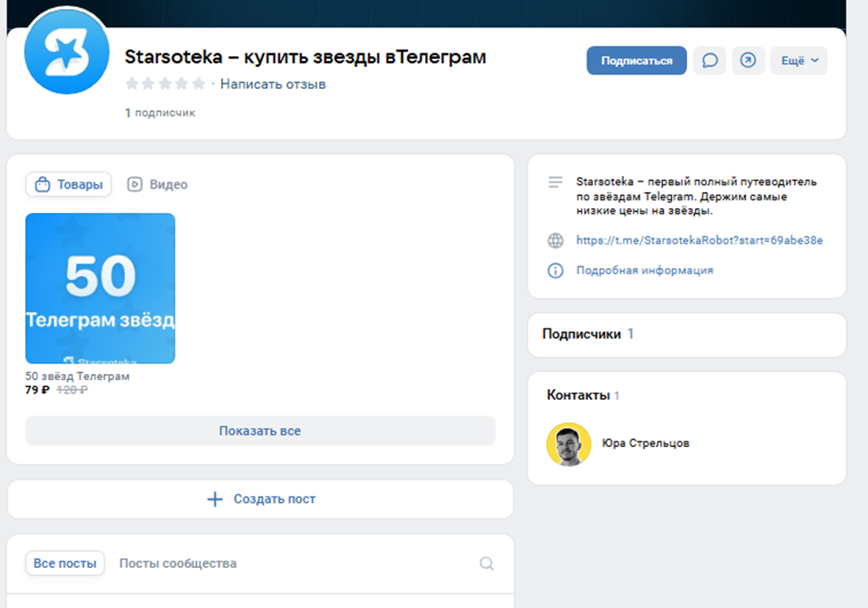 В VK проект представлен группой «Starsoteka – купить звезды в Телеграм». Комьюнити имеет всего 1 последователя, а последний пост на стене датирован 22 июля 2025 года.