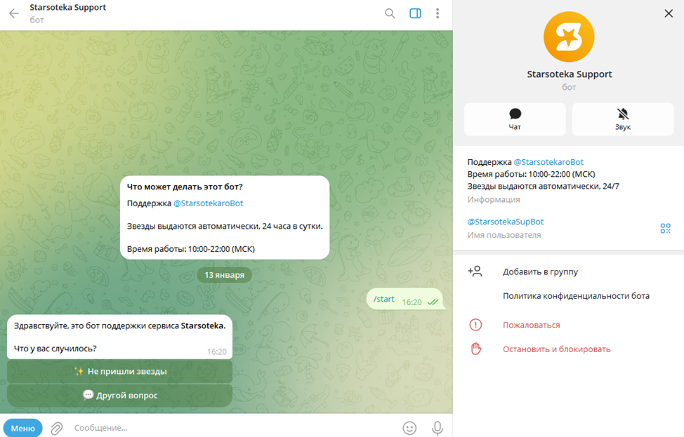 Starsoteka — телеграмм-магазин по продаже токенов Telegram Stars. Пользователям обещают лучшие цены на рынке, а также быстрое зачисление покупки на счет. Мы тщательно проверили бота на скам, и в этом обзоре осветим все «за» и «против» использования этого сервиса.