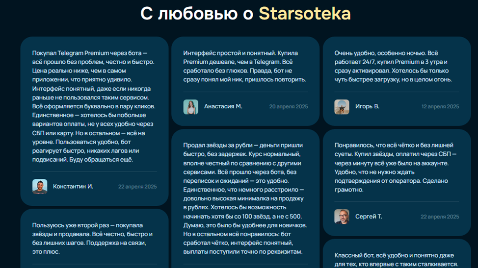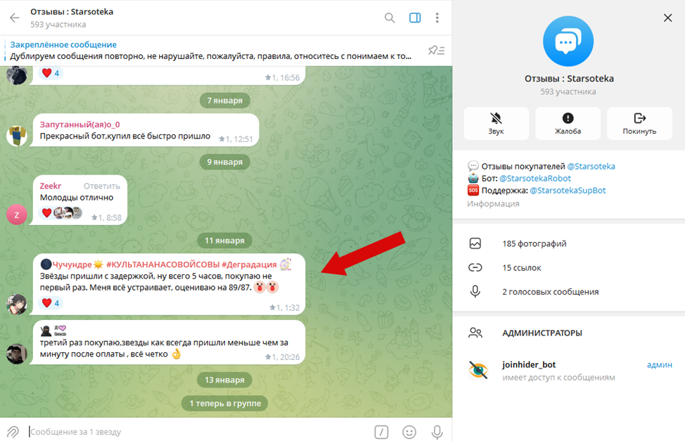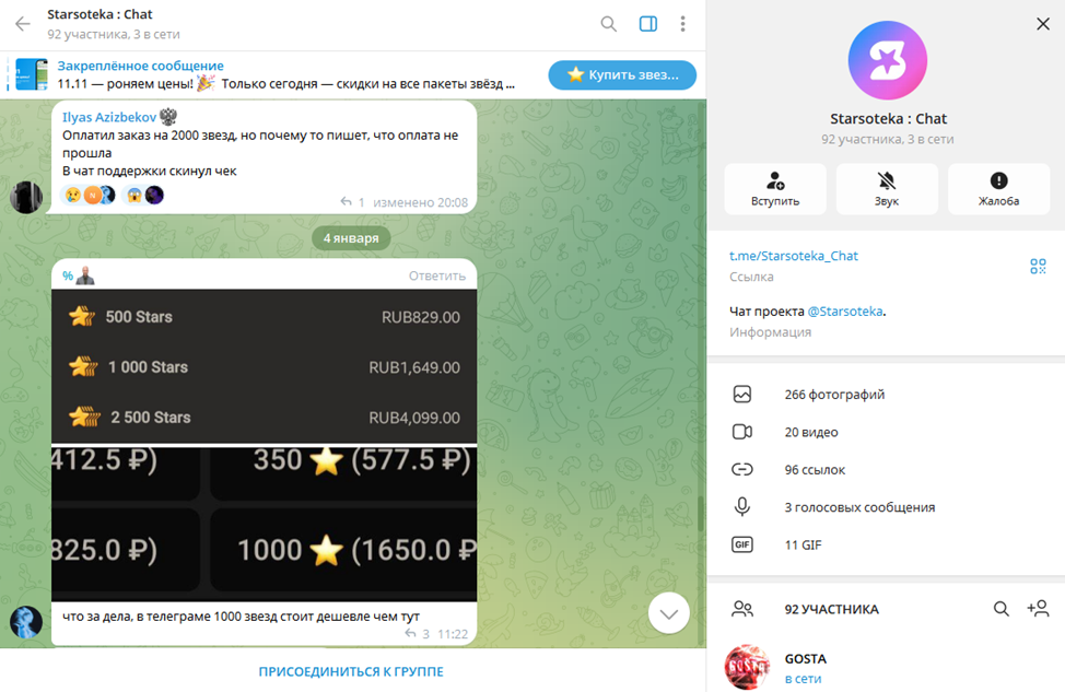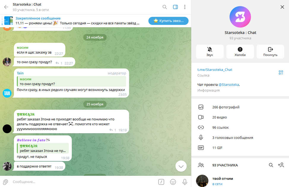 Единственный источник отзывов про маркет Starsoteka — официальный чат и телеграмм-группа, которую курируют основатели проекта. Даже в аффилированных ресурсах пользователи часто жалуются на задержки с доставкой оплаченных звезд, а также довольно медлительную службу поддержки.