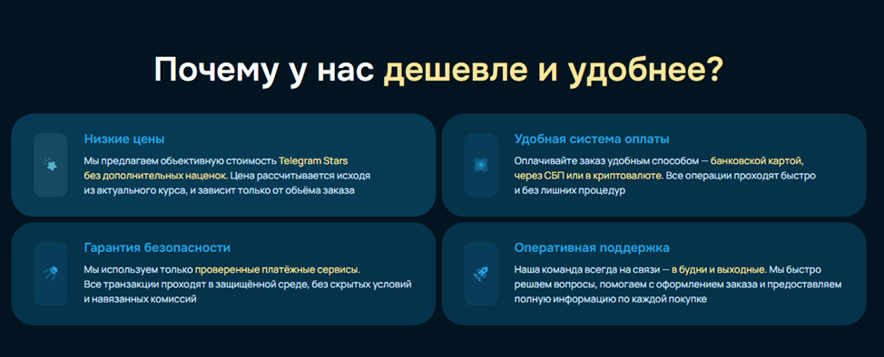Платформа «Старсотека» — альтернативный маркет по продаже и покупке телеграмм-звезд. Создатели предлагают потенциальным клиентам несколько преимуществ: