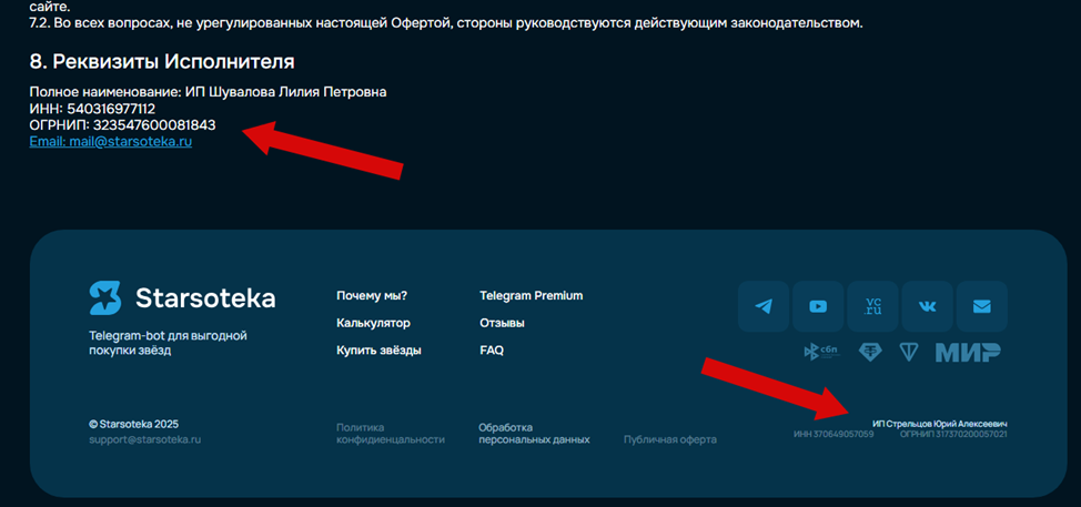 Есть претензии и к юридической информации. Внизу одностраничника указано, что услугу оказывает ИП Стрельцов Юрий Алексеевич с ИНН 370649057059. Но оферта составлена от имени другого предпринимателя — ИП Шувалова Лилия Петровна с ИНН 540316977112. Подобные коллизии могут создать реальные проблемы с возвратом денег и предъявлением претензии о неудовлетворительном качестве сервиса.