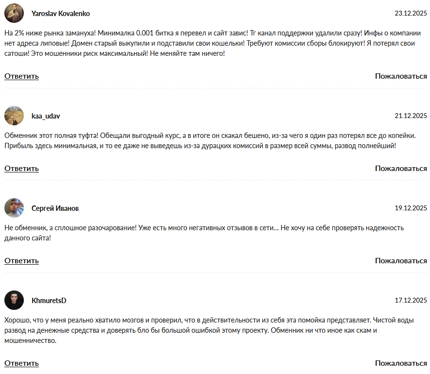 позиционирует себя как надежный криптообменник, но при детальном анализе выявляются серьезные несоответствия. Заявления о многолетнем опыте и тысячах клиентов не подтверждаются: домен зарегистрирован лишь в октябре 2024 года, а сайт запущен в ноябре 2025 года. Отсутствие лицензий и прозрачной информации о компании, неработающие контакты поддержки и сомнительные условия пользовательского соглашения, позволяющие администрации менять правила без уведомления, вызывают обоснованные опасения. Реальные отзывы пользователей указывают на проблемы с выводом средств и отсутствие реакции со стороны сервиса. Рекомендую с осторожностью относиться к подобным платформам и тщательно проверять их надежность перед использованием.