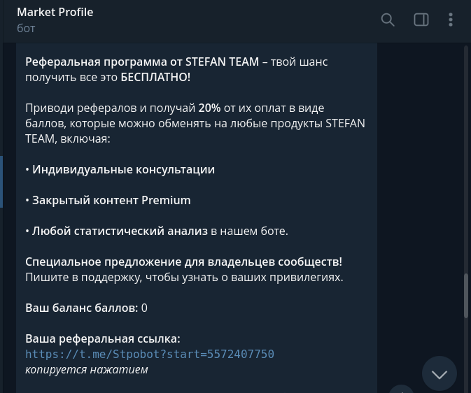 Основная монетизация проекта идет через закрытые инструменты. Новичкам предлагают запустить Stpobot — специального телеграмм-бота для оплаты випки и торговых сигналов. Ценники здесь явно рассчитаны на доверчивую и неопытную публику: