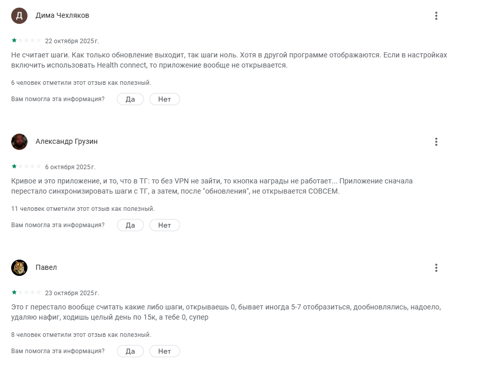 В Гугл Плей достаточно много негативных отзывов на работу приложения. Пользователи сталкиваются с тем, что приложение просто отказывается работать, что оно некорректно считает шаги. Само собой, сведений о том, что кто-то получил награду нет.
