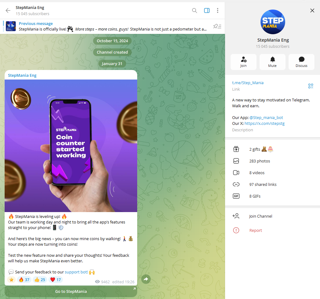 На канале Stepmania в Telegram 15+ тысяч подписчиков. Однако в процентном соотношении активность еще ниже. Посты смотрит в лучшем случае около 1 тысячи человек. Полезного в публикациях авторов мало. В основном сведения касаются простой рекламы данного приложения.