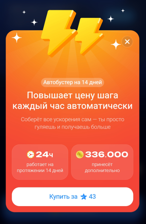 После того как приложение все же отлагает, можно будет ознакомиться с его интерфейсом. Фактически установленное Step Counter App является тем же шагомером. Толку с него нет. Награды получаются внутри Телеграм-приложения. Откровенно их наградами сложно назвать. Каждый шаг, учтенный шагомером обменивается на 1 монету, но можно купить буст для получения двойных наград за 43 звезды в Телеграм:
