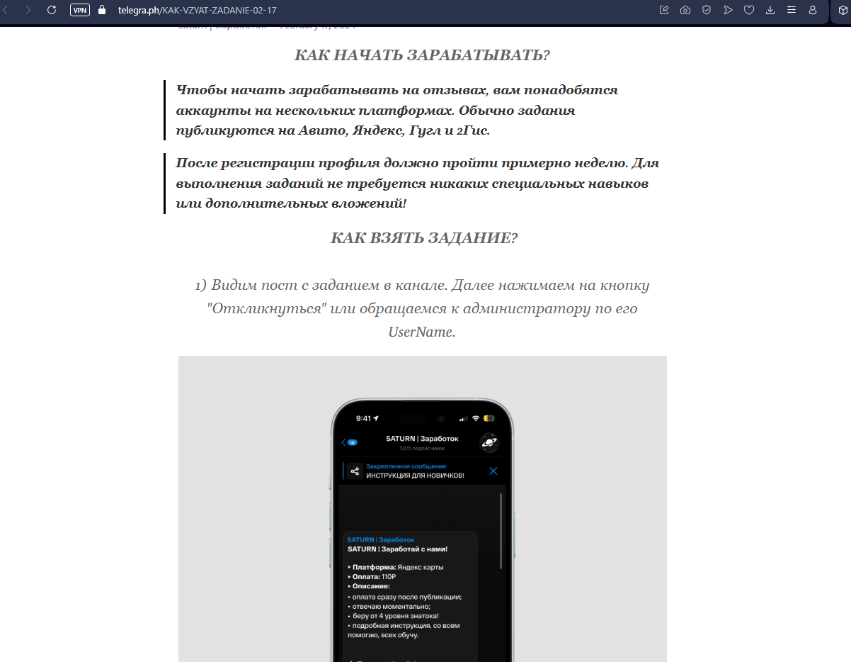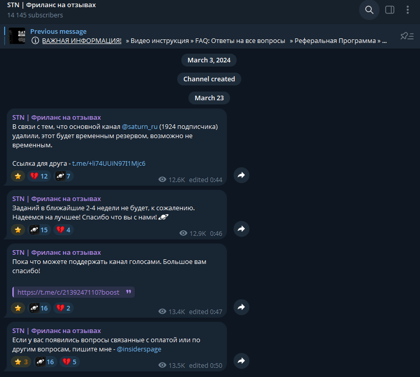 Проект работает через закрытый телеграмм-канал с весны 2024 года. Заявленный владелец указан под ником Edem Tg, поддержка ведется через бота STNhelp Bot t me, а подтвержденные выплаты выкладываются скриншотами в канале Saturn Pay. Для доступа ко внутренним заданиям паблика «Saturn Заработок на отзывах» клиенту нужно подать заявку, пройти небольшой тест при помощи встроенного ИИ и лишь затем детальнее ознакомиться с предстоящей работой.