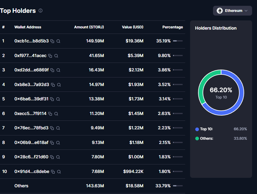 Но стоит отметить тот факт, что количество держателей токена достаточно большое. Это более 100 тысяч адресов. Вот только 66,2% всех токенов хранятся на топ-10 адресах. Движения средств на них может привести к очень быстрому обесцениванию монеты.