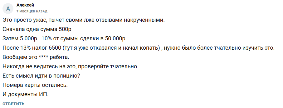 Первым платежом дело не ограничивается. После пробных 500 рублей, нужно будет оплатить страхового агента — 10% от суммы заработанного (5 000 рублей при минимальном депозите), затем налог 13% (6 500 рублей) и так до бесконечности. Пока человек сам не поймет, что его обманывают и не потребует деньги обратно.