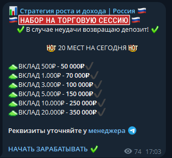 Этот так называемый проект «Стратегия роста и дохода | Россия» — просто очередная ловушка для доверчивых людей. Обещания превратить 500 рублей в 50 000 — это чистой воды обман. Администратор канала, скрывающийся под разными именами, постоянно меняет аккаунты, чтобы замести следы своих махинаций. Отзывы реальных пользователей говорят о том, что после перевода денег начинаются требования дополнительных платежей под разными предлогами, а при попытке вывести средства — блокировка. Неужели кто-то еще верит в эти басни о легких деньгах? Пора уже понять, что бесплатный сыр бывает только в мышеловке.