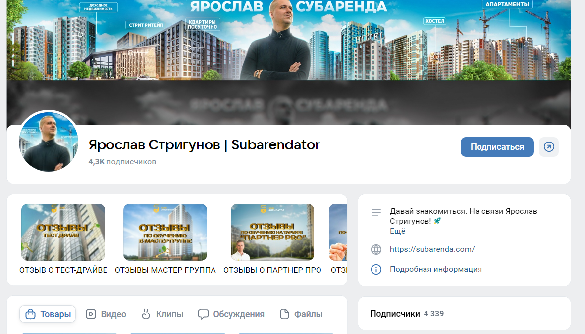 Группа ВК Ярослав Стригунов Subarendator функционирует 2020 года, и здесь 4k фолловеров.