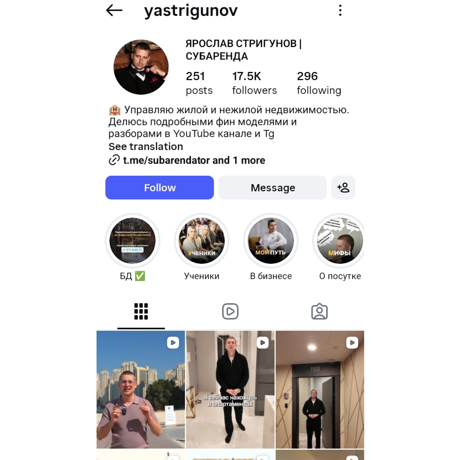 В сообществе основатель размещает видео о запуске своего бизнеса, рассказывает, как работают риэлторы, делится примерами дохода. У эксперта по бизнесу есть страница в Инстаграме Yastrigunov (Ярослав Стригунов Субаренда). Сейчас к нему присоединилось 17+ тыс. пользователей.