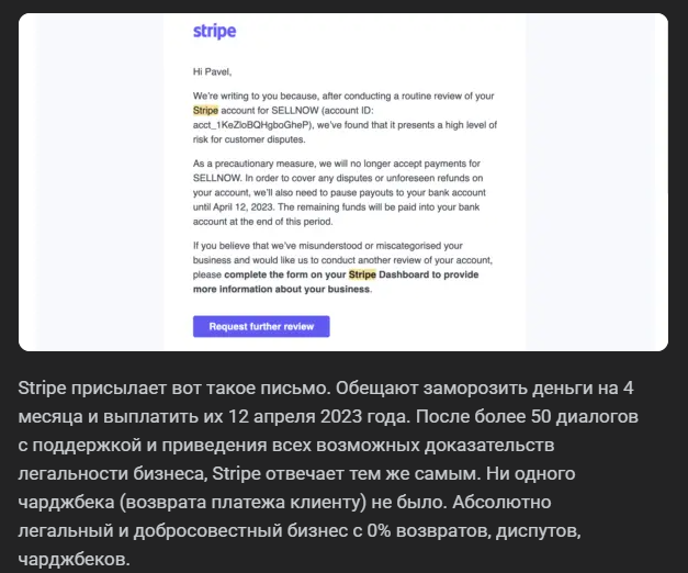 Блокировки в Stripe максимально ужасные. Компания в один момент просто закрывает личный кабинет. Нет претензий, нет требования забрать деньги и уходить в другой банк. Просто человек заходит в один день в личный кабинет и видит, что его деньги теперь у компании.