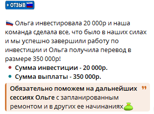 Александра замечает, что никакого риска здесь нет, все депозиты она страхует. Подписчики тг-канала «Строим безбедное будущее» могут быть уверены, что в случае неудачи им вернут деньги. В качестве подтверждения честности Александра выкладывает пост с отзывами о ней и тоже с ошибкой.