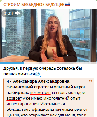 О себе Александра рассказывает немало и даже демонстрирует на видео ту самую лицензию от Центробанка РФ, но рассмотреть в зеркальном отражении имя финансового стратега нельзя. История Александры простая и типичная. Она не могла определиться с профессией, пробовала себя в интернет-заработках и потеряла все деньги,но мириться с этим не хотела, поэтому еще до создания тг-канала «Строим безбедное будущее» начала торговать на бирже.
