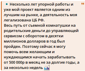 После подобных постов в тг-канале «Строим безбедное будущее» Александра сообщает, что неудачных сессий не было, и призывает торговать криптой. Условия просты: финансовый стратег будет покупать и продавать цифровой актив, а подписчики смогут на этом заработать. Участие не бесплатное, но минимальный порог доступен каждому. Внести на счет трейдера нужно всего лишь базовый депозит в размере ₽500.