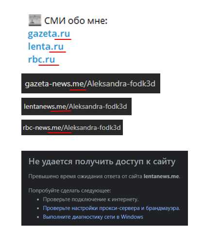 Далее размещены ссылки от банков и интернет-изданий, позитивно отзывающихся про Александру, но есть небольшой недочет, который создатели канала не скрыли — ссылки поддельные. Зайти ни ни один сайт по ссылке с тг-канала «Строим безбедное будущее» нельзя.