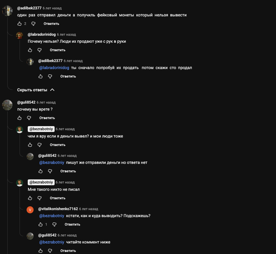 Отзывы о боте можно найти под этим же видео. В них говорится, что пользователи отправили средства по указанной схеме а в результате получили фейковые монеты. Более того, автора ролика обвиняют во лжи.