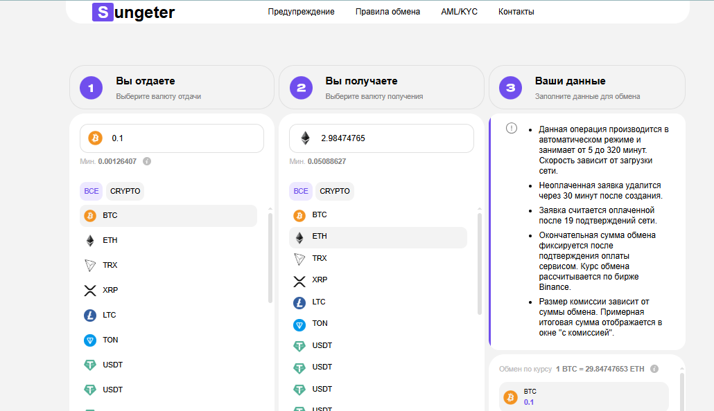Sungeter позиционирует себя как международный обменник, но отсутствие информации о юридическом статусе и команде вызывает сомнения. Непрозрачные условия обмена и возможность заморозки средств без объяснений настораживают. Рекомендую тщательно проверять такие сервисы перед использованием.