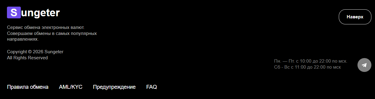 На сайте указаны часы работы операторов: в рабочие дни с 10 до 22 по МСК, а в выходные с 11 по 22. Для связи с ними есть только один вариант — аккаунт в Телеграм Sungeter Exchange (@sungeter_net).