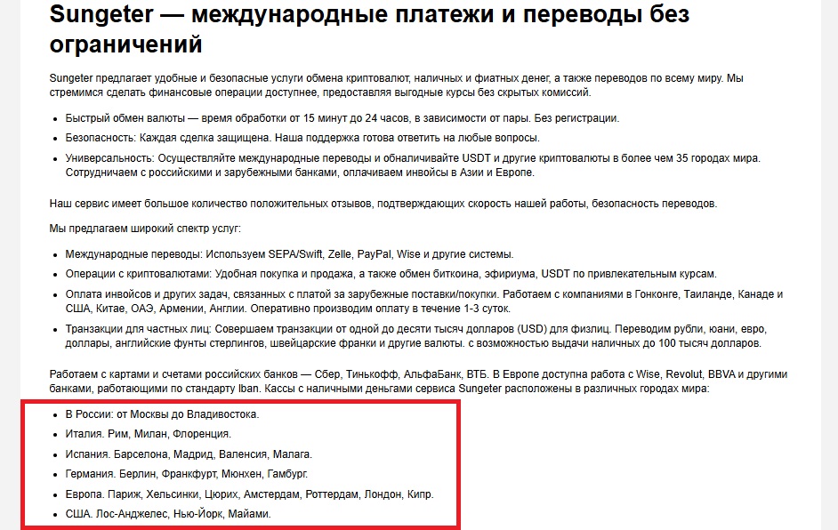 Sungeter позиционируется как международный сервис по обмену наличных, крипты и фиата, в том числе рубля. Со слов владельцев, у них по всему миру есть физические офисы, что гарантирует не только скорость обменов, но и анонимность. Мы проверили что стоит за громкими обещаниями, можно ли им доверять и что говорят о платформе Сангетер отзывы клиентов.