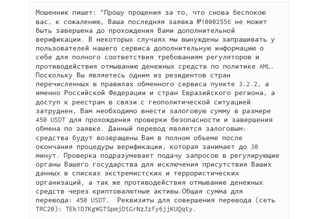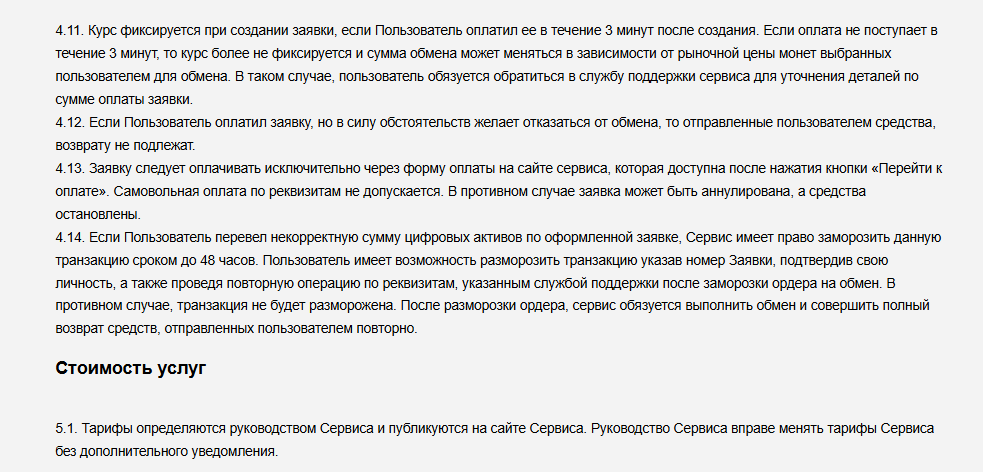 О комиссии, в заявке сказано, что она зависит от обмена, а в правилах называют более точную сумму — 1%. Комиссионные сразу включаются в расчет, но в окне обмена отображается только приблизительная итоговая сумма. Это важный момент. В правилах указано, что при несовпадении суммы перевода с той, что в заявке, операция может быть заморожена. В таком случае пользователю предлагают совершить повторный платеж. Средства блокируют на 48 часов. При поступлении оплаты обещают вернуть продублированную сумму. Если клиент отказывается платить — деньги никто не вернет.