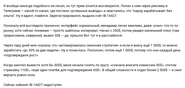 Когда клиент пытался выводить средства – начиналась карусель. Техподдержка сообщала о необходимости внести комиссию за обработку. После оплаты появлялось требование страховки. Потом налог. Затем еще один обязательный платеж.