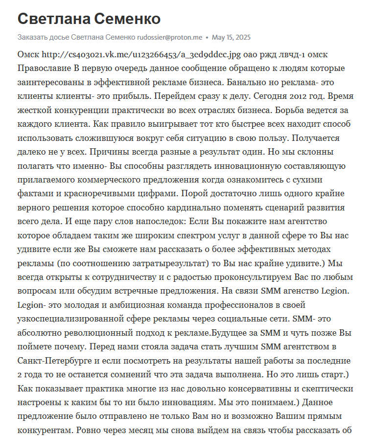 Информацию о предложениях от Светланы найти не удалось. Даже сервис для сбора досье вышел на ложный след. Возможно, что информацию о данном пользователе искали неспроста. Например, девушка могла быть замешана в сомнительной схеме или продвигать подозрительные услуги. К любым предложениям необходимо отнестись с осторожностью.
