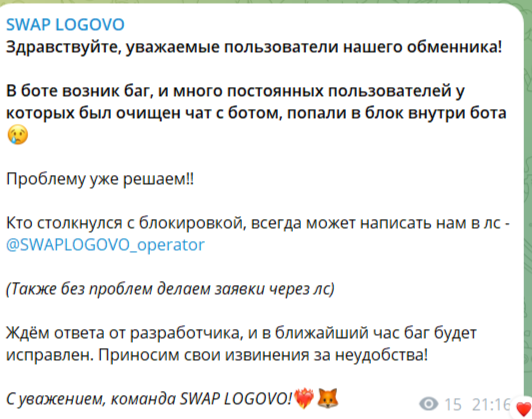 У онлайн-обменника есть информационный канал в Телеграмм, на который в конце апреля 2026 года подписаны 27 человек. Здесь пишут о том, что внутри бота Swap Logovo произошел баг и многие пользователи попали в блок.