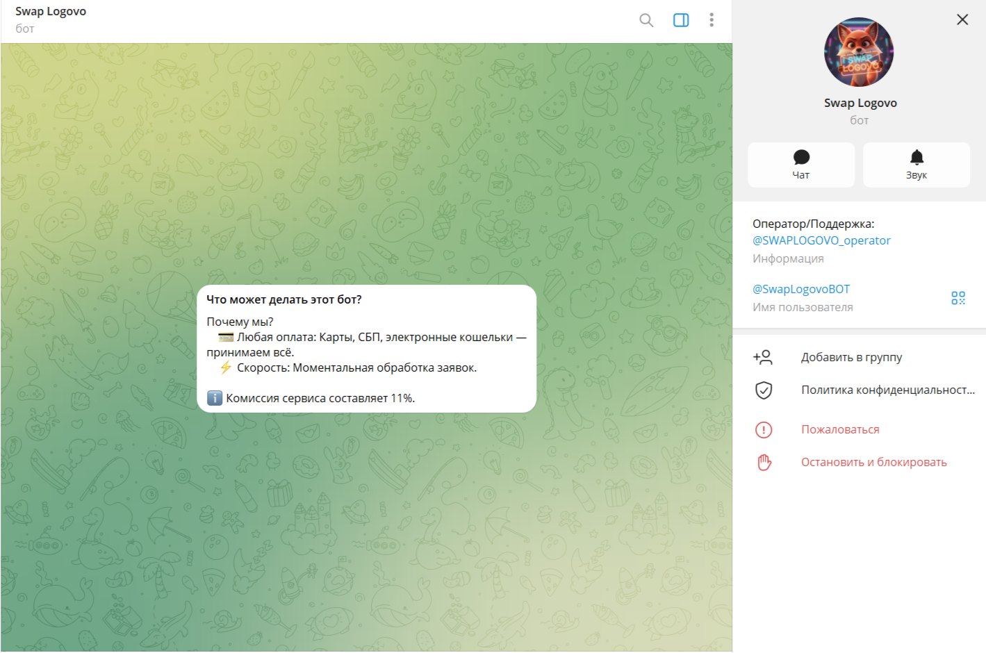 Кто является создателем бота в Telegram, неизвестно, когда он начал работать, установить не удалось. В описании указано, что заявки на обмен обрабатываются моментально, комиссия сервиса Swap Logovo составляет 11% от суммы сделки.