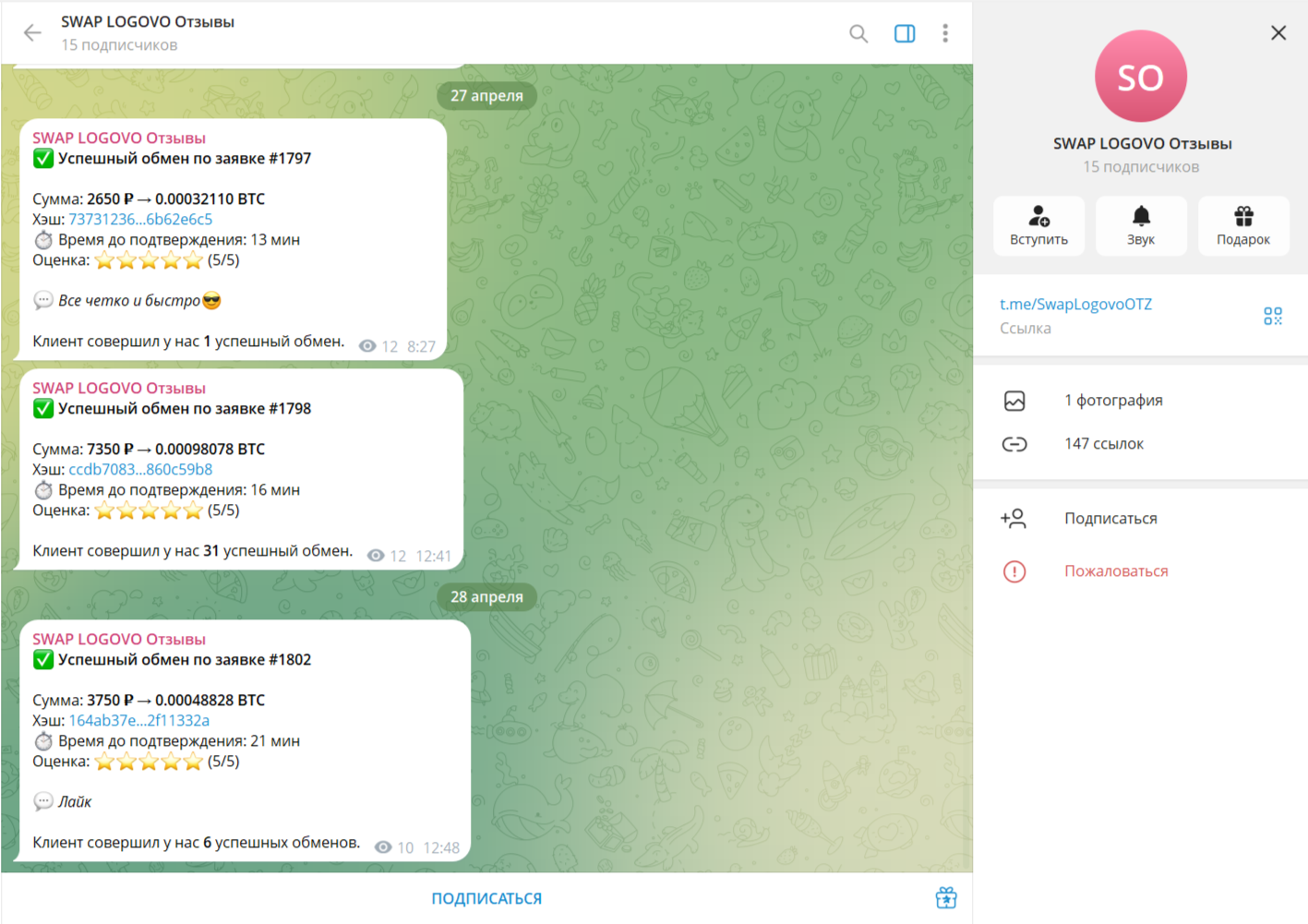 На отдельном канале с отзывами о Swap Logovo публикуются только восторженные отклики юзеров. Люди указывают курс обмена, также пишут, что сделки проходят быстро и четко.