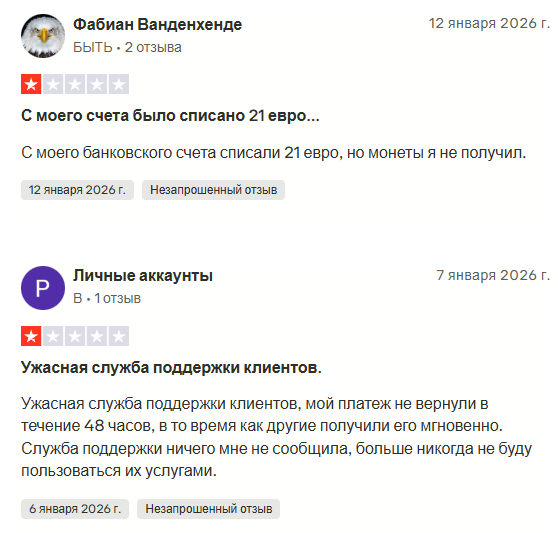 Другой клиент из Бельгии написал о списании €21 без получения монет, а третий пожаловался на задержку возврата средств более 48 часов при полном молчании поддержки.