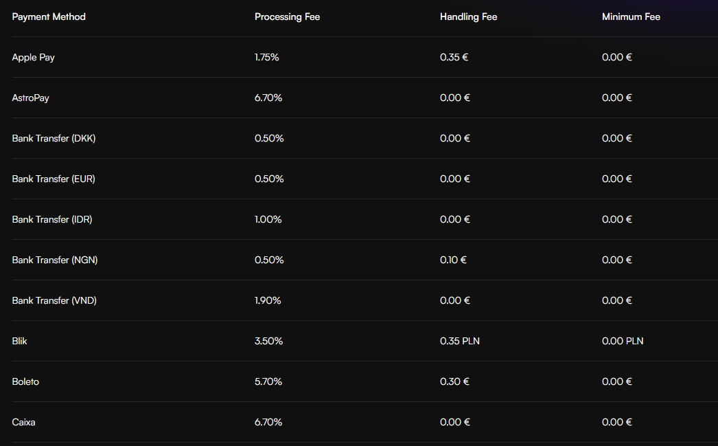 Комиссии зависят от способа оплаты, где за банковскую карту берут 1.75% плюс €0.35 за транзакцию, а за банковский перевод в евро – всего 0.50% без фиксированной надбавки. За Revolut Pay комиссия составляет 1.08%, а самая высокая – у PaySafeCard с 11% плюс €0.60.