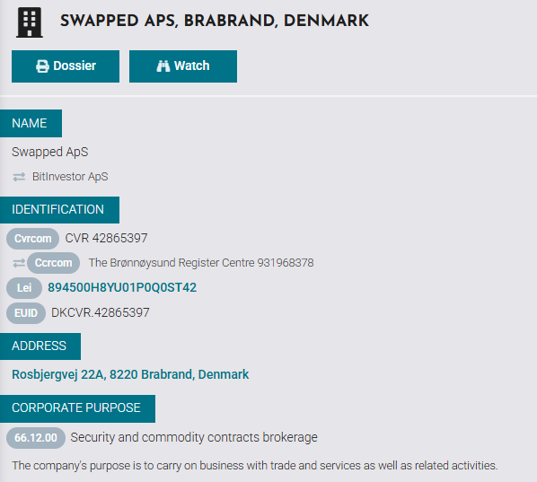 За обменником стоит компания Swapped ApS с датской регистрацией CVR 42865397, а лицензию Датского управления финансового надзора Finanstilsynet сервис получил 2 февраля 2022 года.