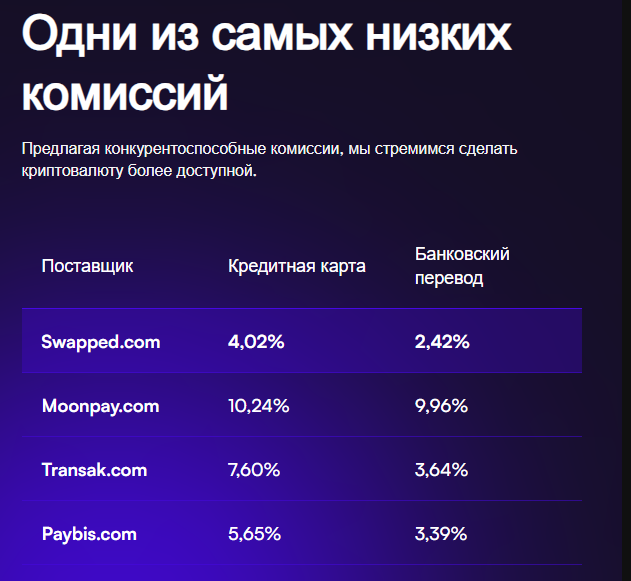 На сайте есть сравнительная таблица для покупки Litecoin на $100 на январь 2026 года: у Swapped com карточная комиссия составила 4.02%, тогда как у Moonpay – 10.24%, у Transak – 7.60%, у Paybis – 5.65%.