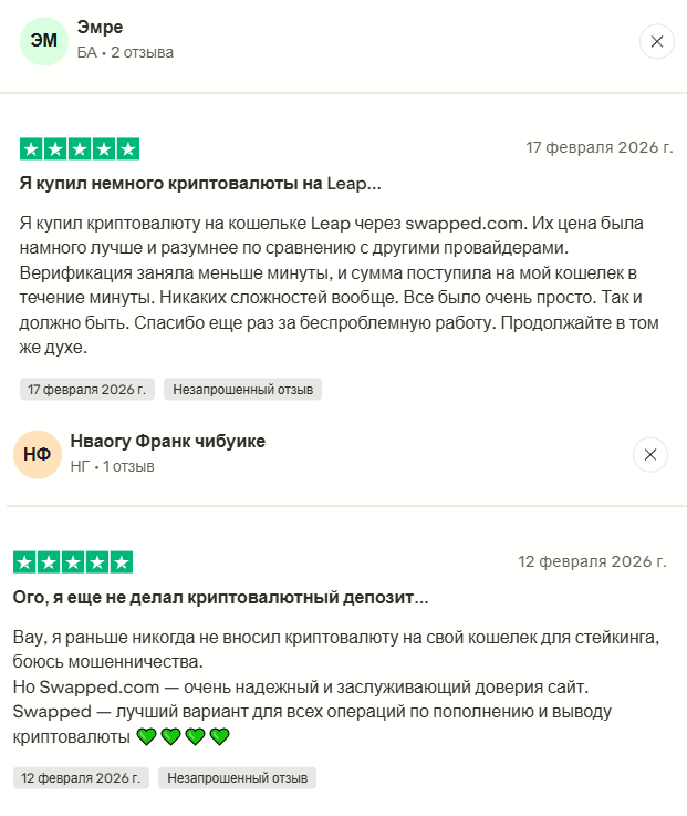 Отзывы о Swapped на Trustpilot в основном положительные – рейтинг платформы составляет 4.5 из 5. Довольные пользователи отмечают быструю верификацию и моментальную доставку криптовалюты на кошелек. Один клиент написал, что весь процесс от покупки до получения монет занял меньше минуты, а цена оказалась выгоднее конкурентов.