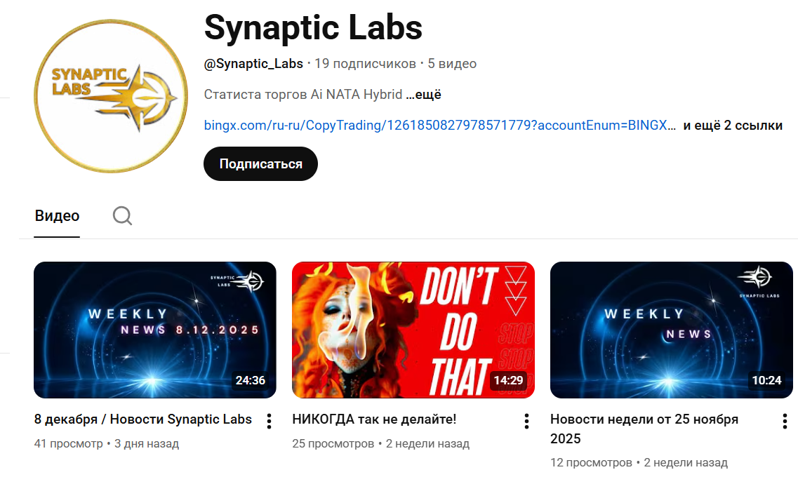 Помимо телеграмм-группы у проекта есть канал на Ютубе. У него всего 19 подписчиков и выложено 5 видео о новостях Synaptic Labs.