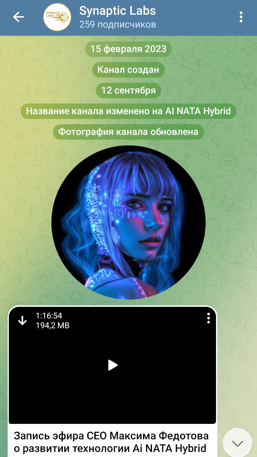 Канал в ТГ Synaptic Labs Rus ведется с 15 февраля 2023 года. Это его текущее название. До этого он назывался AI NATA Hybrid, MacrosMatic.