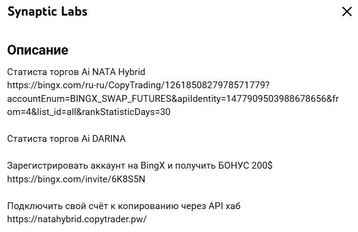 Проект Synaptic Labs предлагает торговать с помощью AI NATA Hybrid и AI DARINA. Для этого нужно: