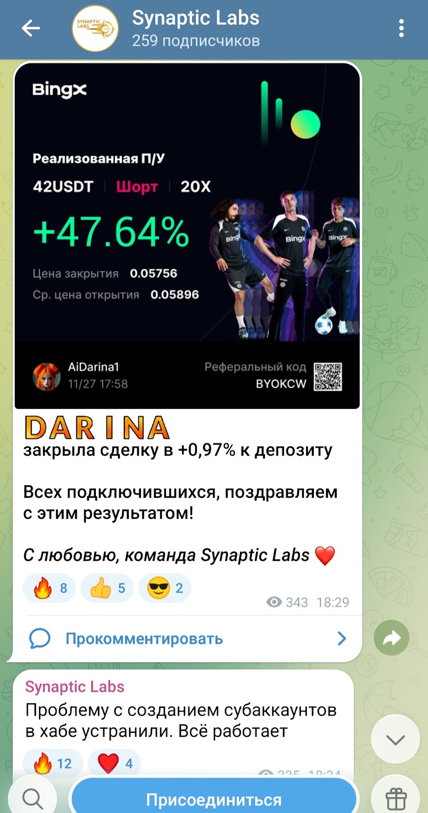 Это послужило причиной смены названия проекта. Теперь AI NATA Hybrid продвигается через ТГ канал Synaptic Labs. Последнее время также ведется реклама AI DARINA. Публикуются отчеты по работе этих программ, новости из финансовой сферы.