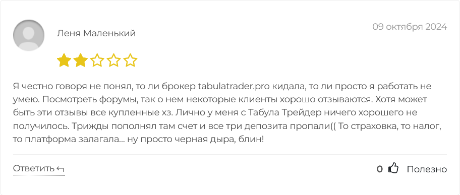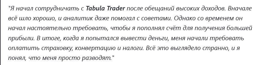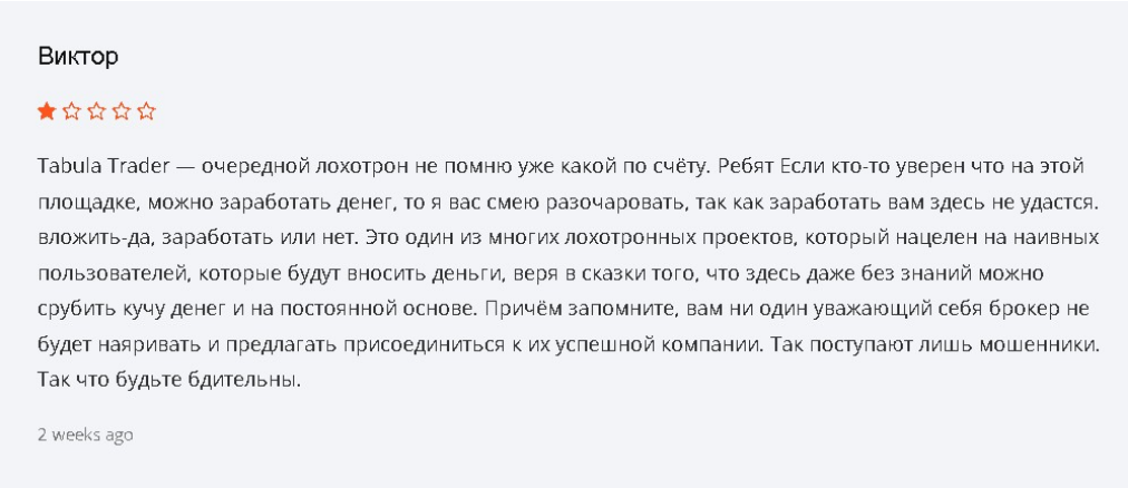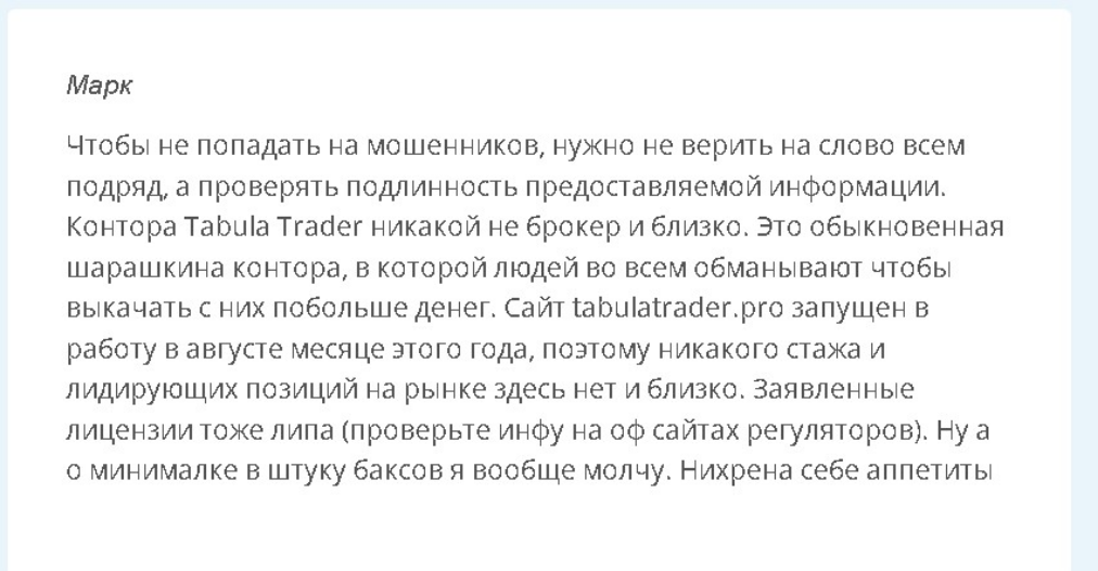 - Наличие только негативных откликов о TabulaTrader pro свидетельствует об испорченной репутации платформы.