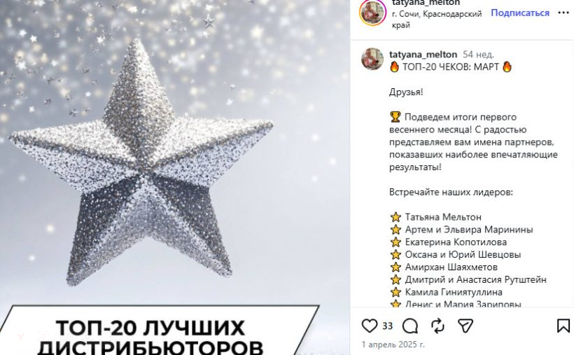 Татьяна в RC Group с 2025 года. Входил в ТОП-20 лучших несколько раз. Это значит, что привлекала больше всех новых членов. В аккаунтах @tatyana_melton фотографии красивой жизни, личных успехов и кадров «жизни сообщества».