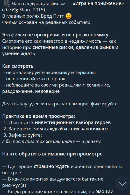 Также у Татьяны есть телеграм-канал «КиноКлуб Татьяны Шкредовой», где всего 82 участника. Здесь девушка практикует интересный формат: предлагает смотреть определенные фильмы и анализировать их на предмет эмоций, действий и инвестиционных решений героев и т.д. После просмотра участники клуба собираются в Zoom и обсуждают кино..