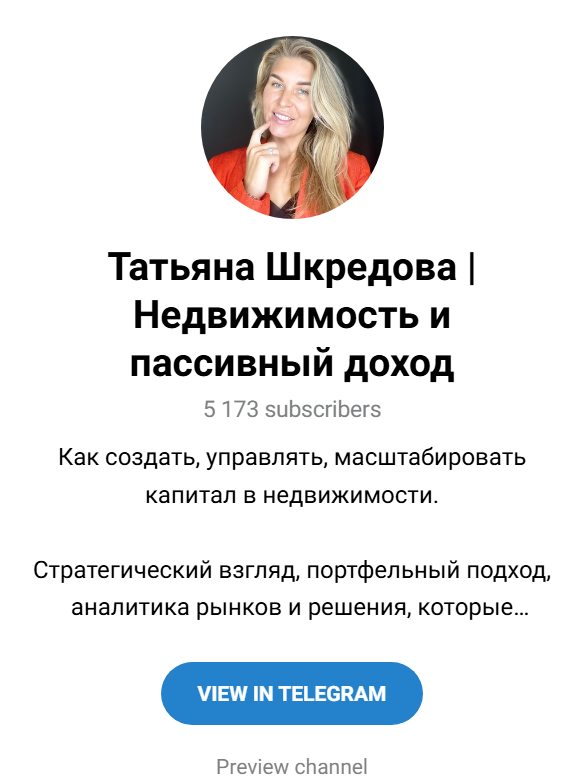Татьяна Шкредова ведет телеграм-канал «Татьяна Шкредова Недвижимость и пассивный доход» (Property Wealth Management) с 2018 года. Сейчас на него подписано 5 173 человека. Активность участников низкая, просмотров в среднем 300, реакций и комментариев единицы.