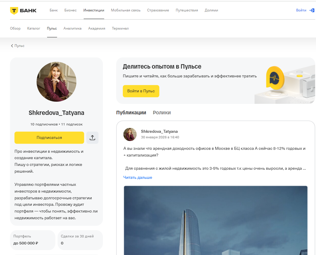 Татьяна ведет страницу на портале «Пульс» от «Т-Банка». Там мы узнали, что она оказывает услуги по разработке, аудиту инвестиционных портфелей и доверительному управлению ими. Также в открытых источниках написано, что она владеет группой компаний в сфере инвестиций в недвижимость в России и Дубае.