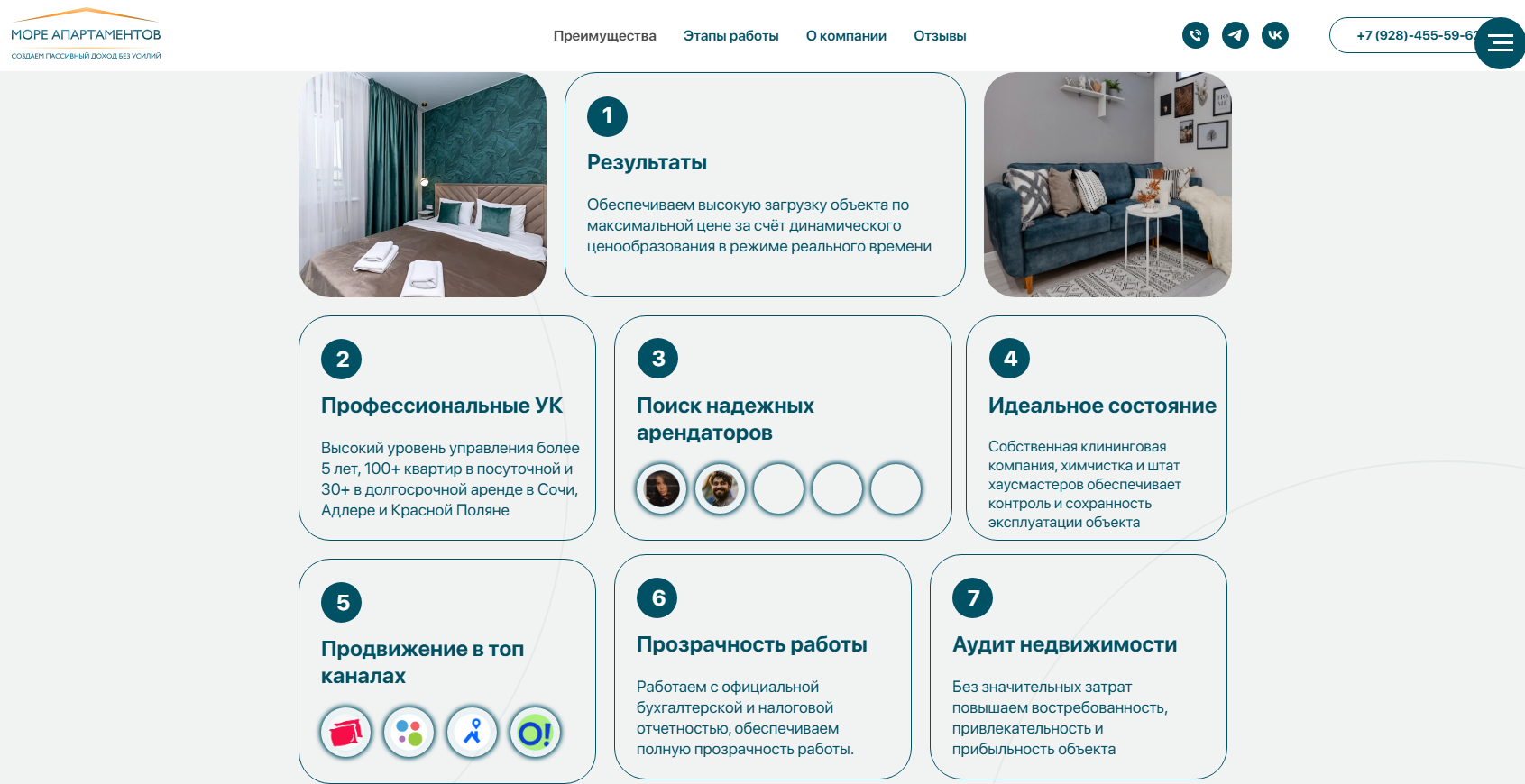У Татьяны есть проект – «Море апартаментов». Он презентован на сайте moreap ru и является посредником между арендодателями и арендаторами. Сотрудники компании сдают квартиры за их владельцев. Обеспечивают не только поиск жильцов, но и подготовку жилья к сдаче, контроль за его сохранностью, оформление необходимых документов и отчетов.