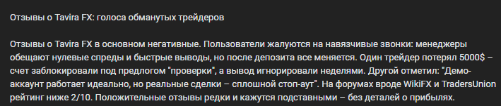 Менеджеры организации обещают максимально выгодные условия, включая нулевые спреды – обещают, что выводить деньги с кошелька легко и быстро. На деле все оказывается совсем иначе. Например, автор одного из отзывов о TaviraFx com потерял $5,000 – сначала его счет заблокировали для проведения якобы проверки, но процедура затянулась на недели, и дело кончилось убытками.